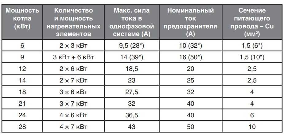 Подключается котлоагрегат к электрической сети через диффеенциальный автомат защиты или связку УЗО + автоматический выключатель (по 1 выключателю на каждую фазу). Силовой кабель должен иметь достаточное сечение, рассчитать которое можно, например, исходя из мощности электрокотла.