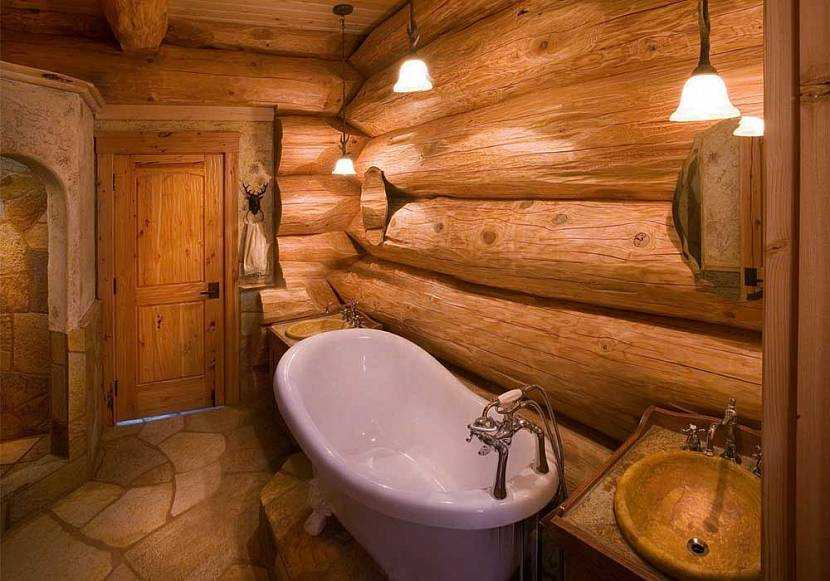 Дизайн интерьера санитарного узла ограничивается только фантазией человека, строящего деревянный дом. Облицовка стен, сантехника может быть любая. Главное — соответствие требованиям водостойкости, а также санитарным нормам. Для этого вертикальные поверхности обрабатываются специальными антисептическими составами, которые эффективно защищают дерево от плесени, грибка и гниения. Душевая кабина или большая ванна типа джакузи — выбор интерьера принадлежит исключительно хозяину в соответствии с его возможностями.
