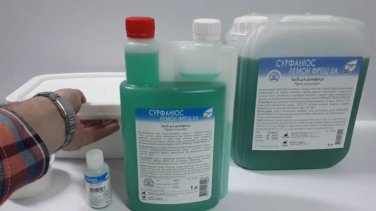 - «Сурфаниос лемон фреш» — несмываемый препарат-антисептик для пластиковых, металлических, резиновых поверхностей. Состав безопасен для людей.