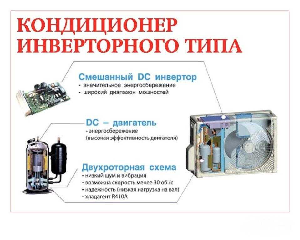Инверторный кондиционер отличается от стандартного меньшим потреблением электроэнергии и большей износоустойчивостью двигателя.