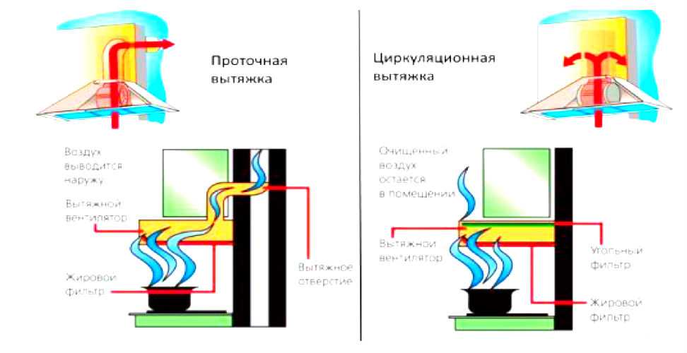 Различают два основных режима работы вытяжек — рециркуляция и отвод воздуха. В случае рециркуляции — воздух прогоняется через фильтры в вытяжке и возвращается обратно в помещение. В этом случае не используются вентиляционные каналы и из помещения не выходит ни воздух, ни тепло.