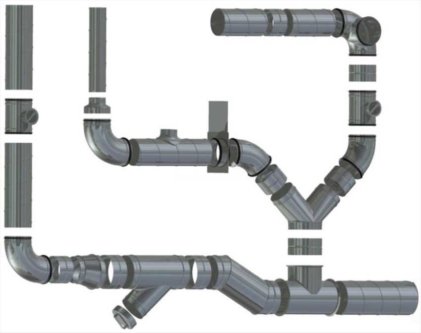 Воздуховоды из канализационных труб собирают в соответствии с составленным проектом. ПП трубы и фитинги соединяют стыковой пайкой, ПВХ – холодной сваркой