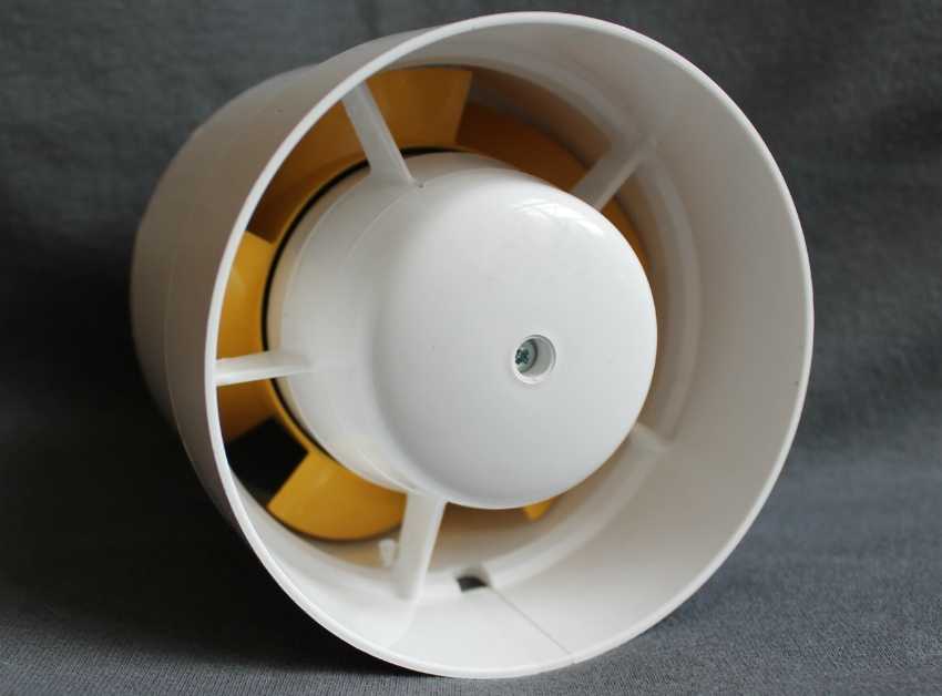 Центробежная вытяжка для ванной включает в свое устройство крыльчатку с несколькими рядами ребер-лопастей. В центре – вал, проходящий сквозь корпус вентилятора. Поток воздуха захватывается краями лопастей, затем разворачивается на 90 ⁰ С, а центробежная сила разгоняет его еще быстрее.