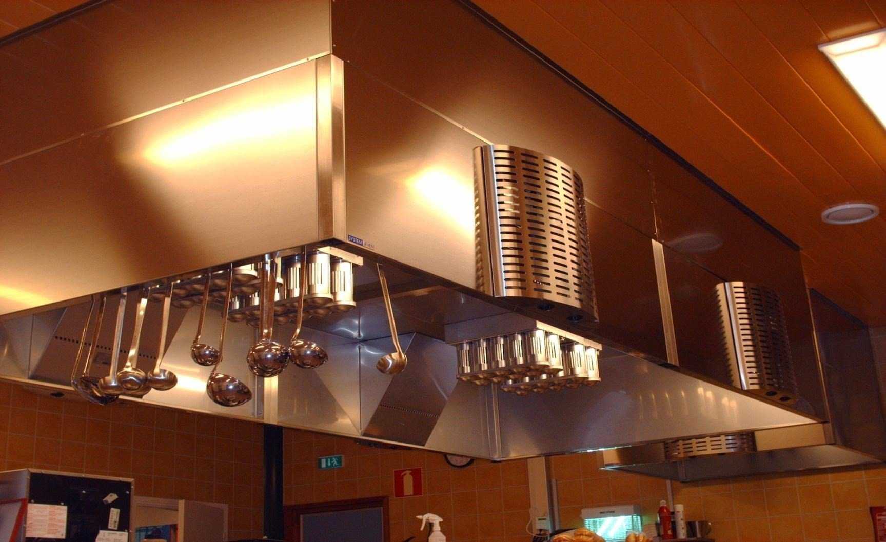 Вытяжные зонты устанавливаются на кухнях кафе и ресторанов над варочными панелями и духовыми шкафами. Горячий воздух и пар поднимаются вверх и сразу попадают в купол вытяжного зонта. Для усиления эффективности в зонт часто встраивают вентилятор. Существуют и приточно-вытяжные модели кухонных зонтов.